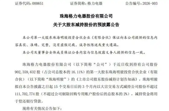 2月25日,格力电器就公司第一大股东珠海明骏投资合伙企业(有限合伙)(下称“珠海明骏”)的部分股份减持计划发布公告。