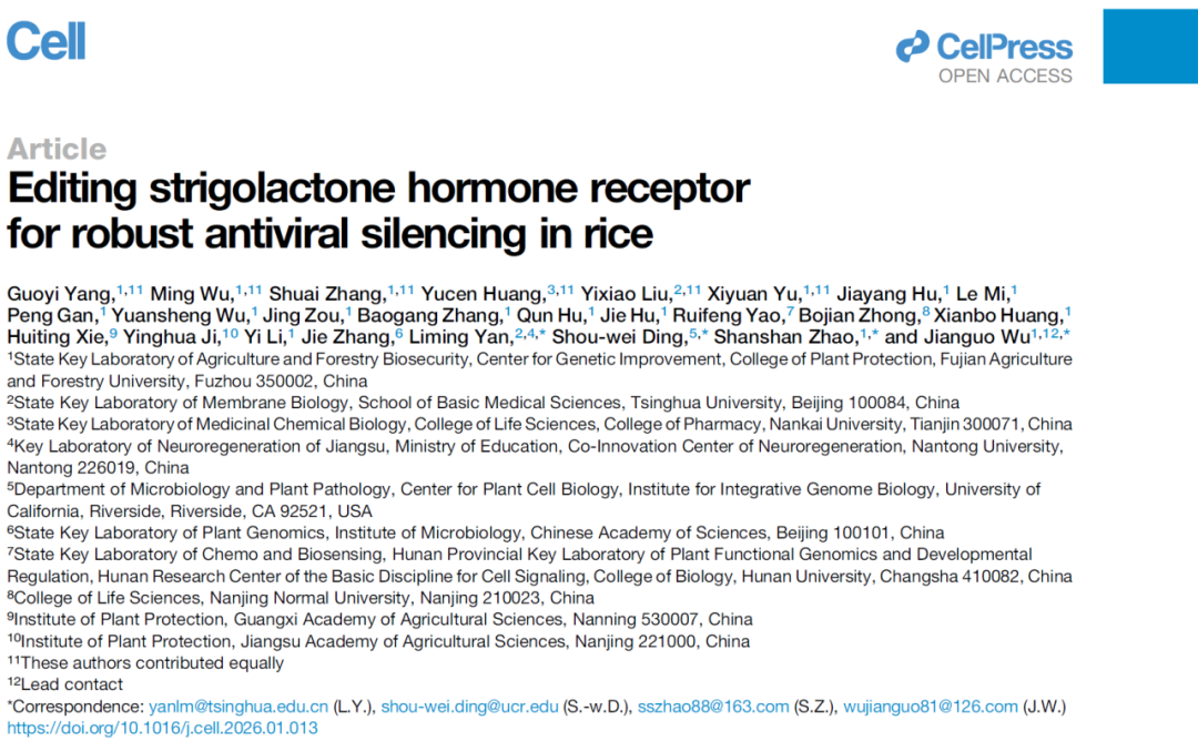 2月24日,福建农林大学农林生物安全全国重点实验室吴建国教授团队,联合加利福尼亚大学河滨分校杰出教授丁守伟博士和清华大学闫利明研究员,在 Cell (《细胞》)发表题为 “Editing Strigolactone Hormone Receptor for Robust Antiviral Silencing in Rice” (编辑独脚金内酯激素受体强化水稻抗病毒 RNA 沉默能力)的研究论文,在机制层面贯通了独脚金内酯激素信号通路与动植物中高度保守的抗病毒 RNA 干扰(RNAi)免疫体系,推动了植物免疫理论的重大跃升,实现了从机制发现到精准育种应用的完整闭环。中国科学院生命科学和医学部谢道昕院士、钱前院士、何祖华院士给予高度评价。