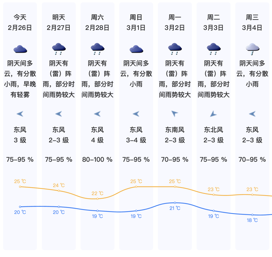 预计26日阴天间多云,有分散小雨,早晚有轻雾,气温20-25℃;