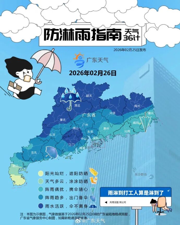 26日(初十),肇庆、清远和韶关市县阴天有中雷雨局部大雨;河源、梅州、粤东和珠三角其余市县多云到阴天,有分散小雨,其余市县多云,局部有小雨。