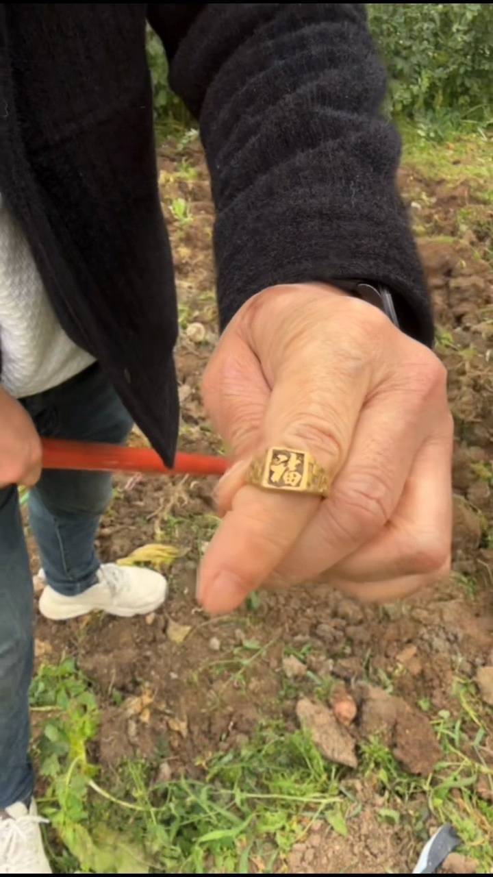 今年春节,兄妹四人回乡过年。2月23日,他们来到屋后整理菜地,打算翻土后重新种植蔬菜。当时,刘昭婵的哥哥姐姐忙着弯腰挖土,她的丈夫严先生则拿着锄头,将挖出来的大块泥土敲碎,结果第一敲就发现了那枚刻着“福”字的金戒指。