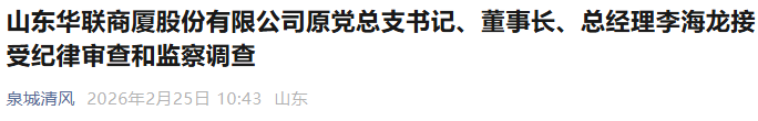 据槐荫区纪委监委消息:山东华联商厦股份有限公司原党总支书记、董事长、总经理李海龙涉嫌严重违纪违法,经济南市纪委监委指定管辖,目前正接受济南市槐荫区纪委监委纪律审查和监察调查。