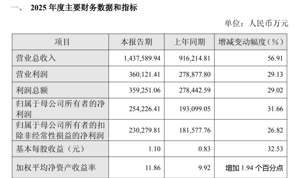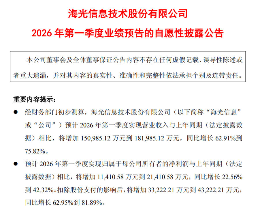 2月25日晚间,海光信息(688041)披露2026年一季度业绩预告。公司预计2026年一季度实现营业收入39.1亿元—42.2亿元,同比增长62.91%—75.82%;预计归母净利润为6.2亿元—7.2亿元,同比增长22.56%—42.32%。同日海光信息还披露了2025年度业绩快报。公司2025年度实现营业收入14.38亿元,同比增长56.91%;归母净利润为25.42亿元,同比增长31.66%。
