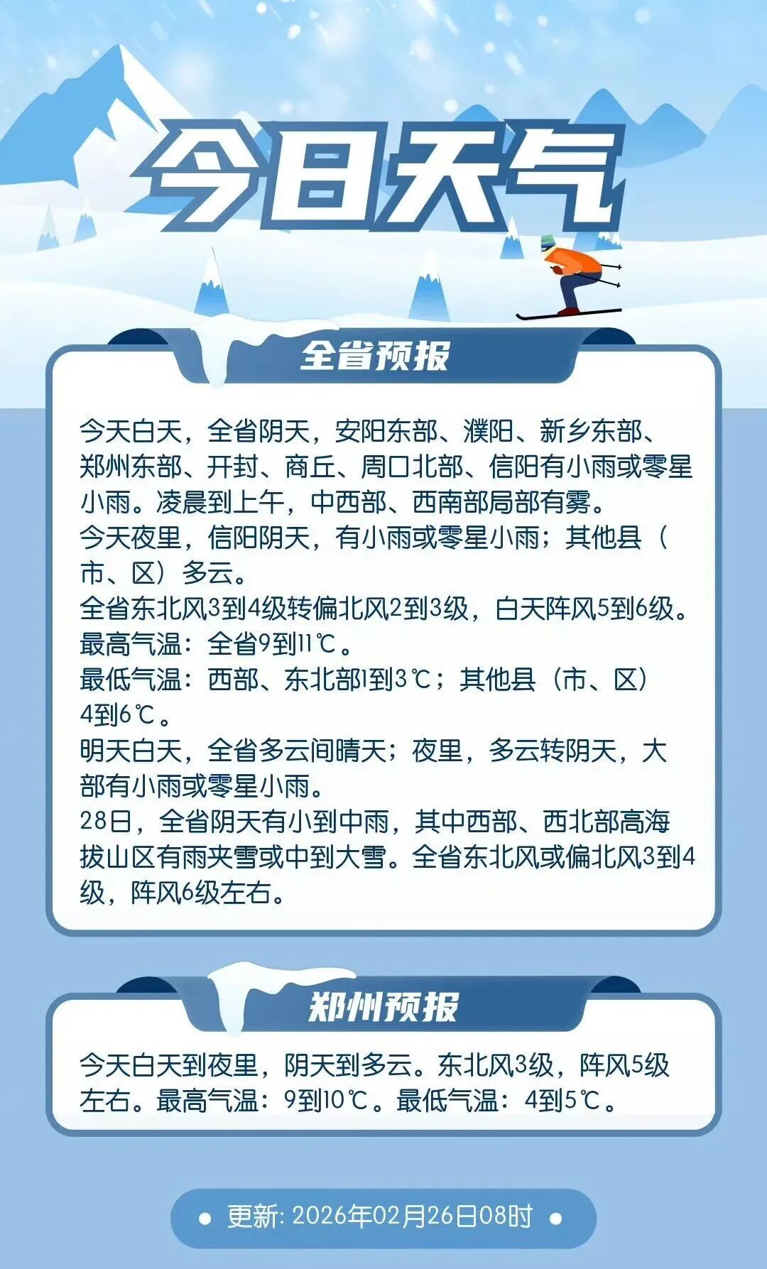 今天是2月26日,回顾昨天夜里,全省大部分地区都经历了小雨,南阳东部、驻马店南部和信阳局部雨势较强,达到了中雨级别。湿冷的空气正逐步渗透进城市的街巷。