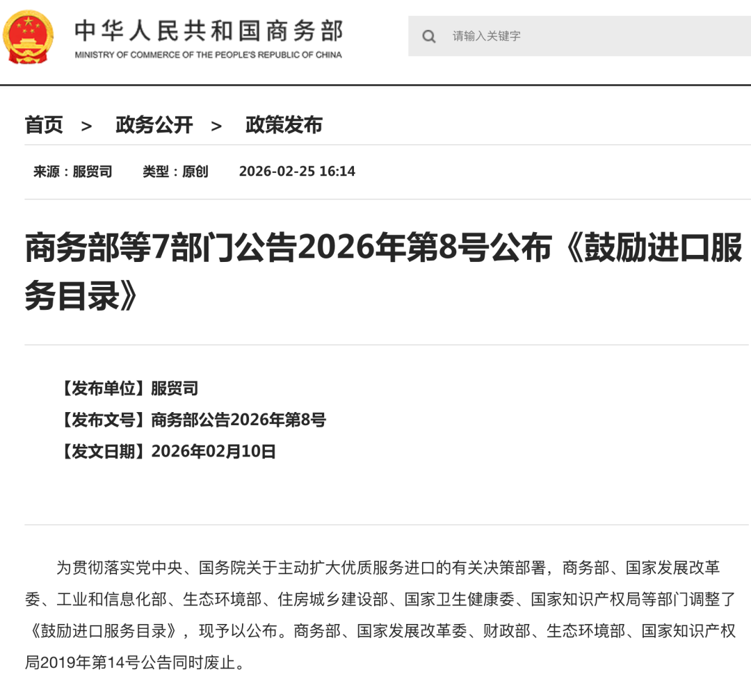 今天,商务部等7部门发布公告调整《鼓励进口服务目录》,详情如下: