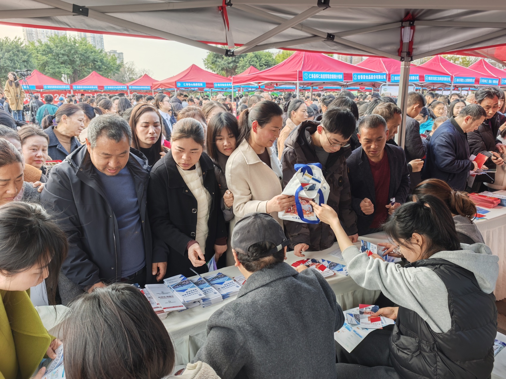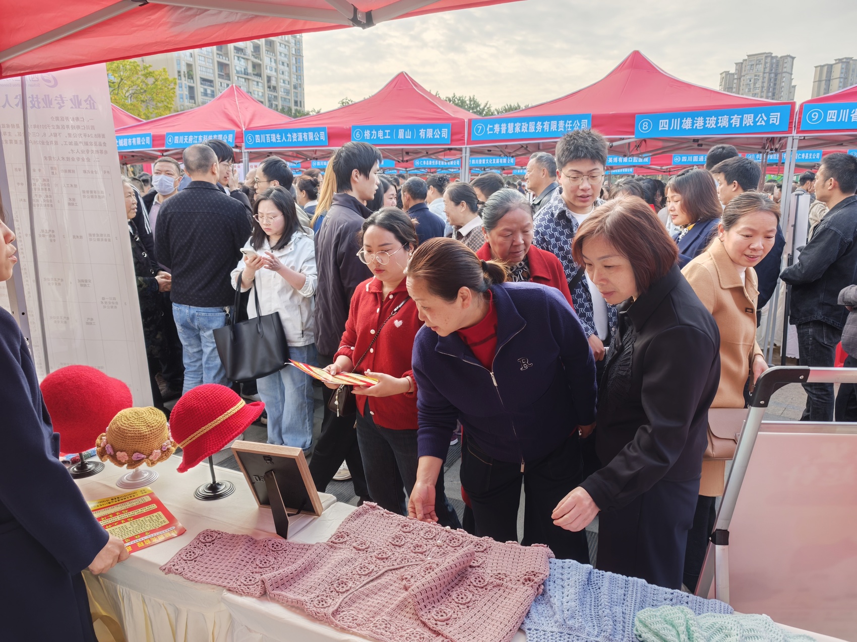 招聘会现场,人气高涨、供需两旺。80余家县内外优质企业参加招聘会,涵盖服务业、生产制造、批发零售、光电信息等多个行业,提供岗位5300余个。依托劳务协作与“商会+就业”机制,仁寿县同步征集243家外地合作企业8000余个优质岗位,以展板集中展示,进一步拓宽求职者选择空间。