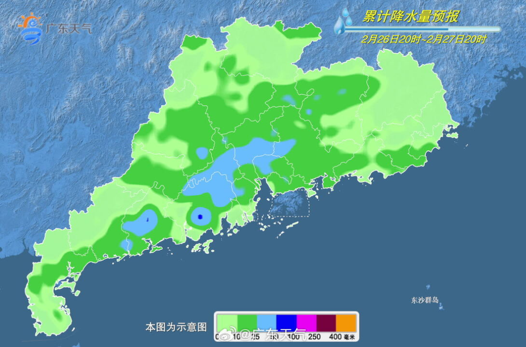 今起至2月28日,广东自北向南有一次中到大雨局部暴雨的降水过程,部分市县伴有雷电、短时强降水和6~8级的短时大风。