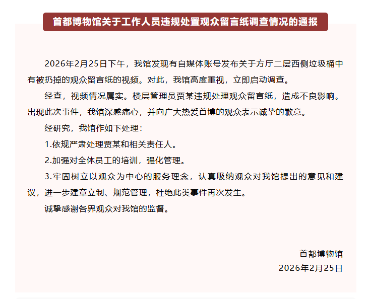 观众留言纸,居然被当成了废纸。近日,首都博物馆管理员贾某将当日的观众留言纸丢入垃圾桶,后来被网友发现,拍摄视频发布到社交平台,引发关注。网友热议:“原来留言纸是真的不看不收不保留。”此次事件暴露出该博物馆在留言管理方面存在的漏洞,也引发了公众对博物馆服务细节的关注。
