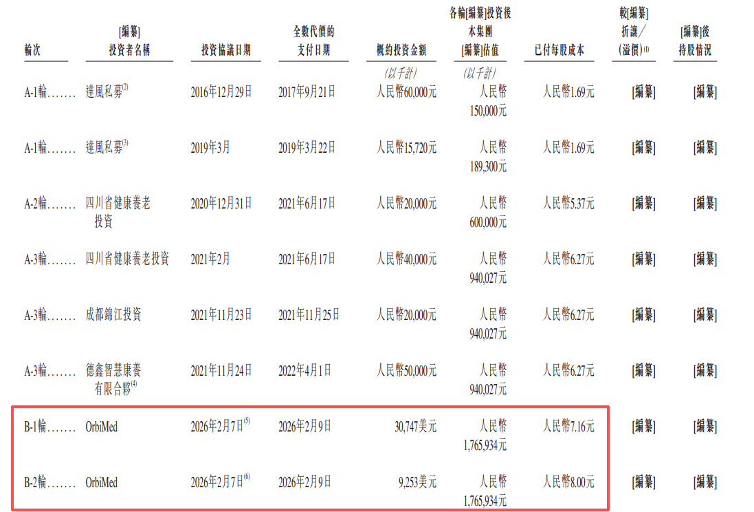 就在递交上市申请前夕,锦欣康养于2025年2月9日完成了B-1和B-2轮融资,合计融资金额为4000万美元,投资方为OrbiMed。据招股书显示,此轮投资后,公司估值达17.66亿元。