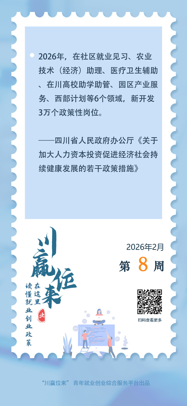 根据四川省人民政府办公厅近日印发的《关于加大人力资本投资促进经济社会持续健康发展的若干政策措施》,今年四川将新开发3万个政策性岗位,覆盖社区就业见习、农业技术(经济)助理、医疗卫生辅助、在川高校助学助管、园区产业服务、西部计划等6个领域,进一步为高校毕业生等重点群体就业拓展岗位。