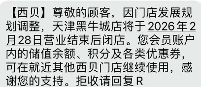 近日,有天津西贝会员收到短信通知,称西贝天津黑牛城道店将于2月28日关店,会员卡储值可以在其他门店继续使用。记者向店方求证后确认消息属实。