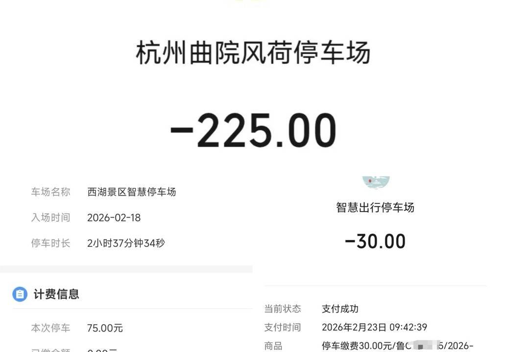 除了王先生,封面新闻还留意到多位游客在社交平台晒出了西湖景区不同停车场的收费账单——“210元”“180元”“75元”等,账单时间多集中在2月10日至23日春节黄金周期间。