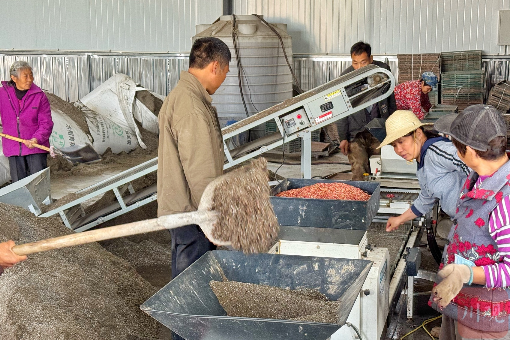 记者来到育秧流水线设备旁,只见10余名村民分工明确,有的负责放置育秧盘,有的负责添种子,还有的负责添水稻育秧基质,不到1分钟就能完成3至5盘的育秧装盘工作。