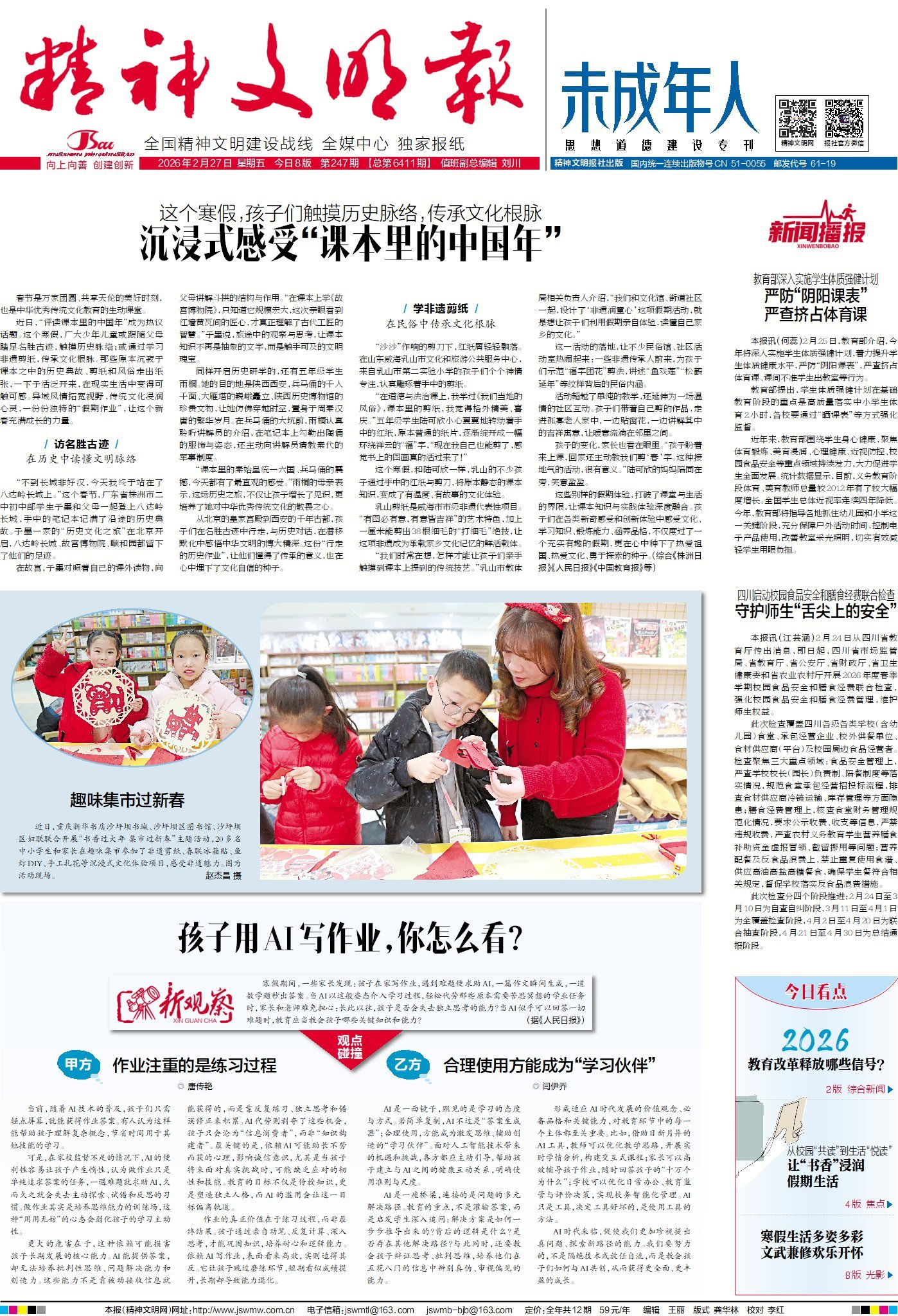 近日,“评读课本里的中国年”成为热议话题。这个寒假,广大少年儿童或跟随父母踏足名胜古迹,触摸历史脉络;或通过学习非遗剪纸,传承文化根脉。那些原本沉寂于课本之中的历史典故、风俗走出纸张,一下子活泛开来,在现实生活中变得可触可感。今日1版头条,带你看孩子们如何完成这份独特的“假期作业”。
