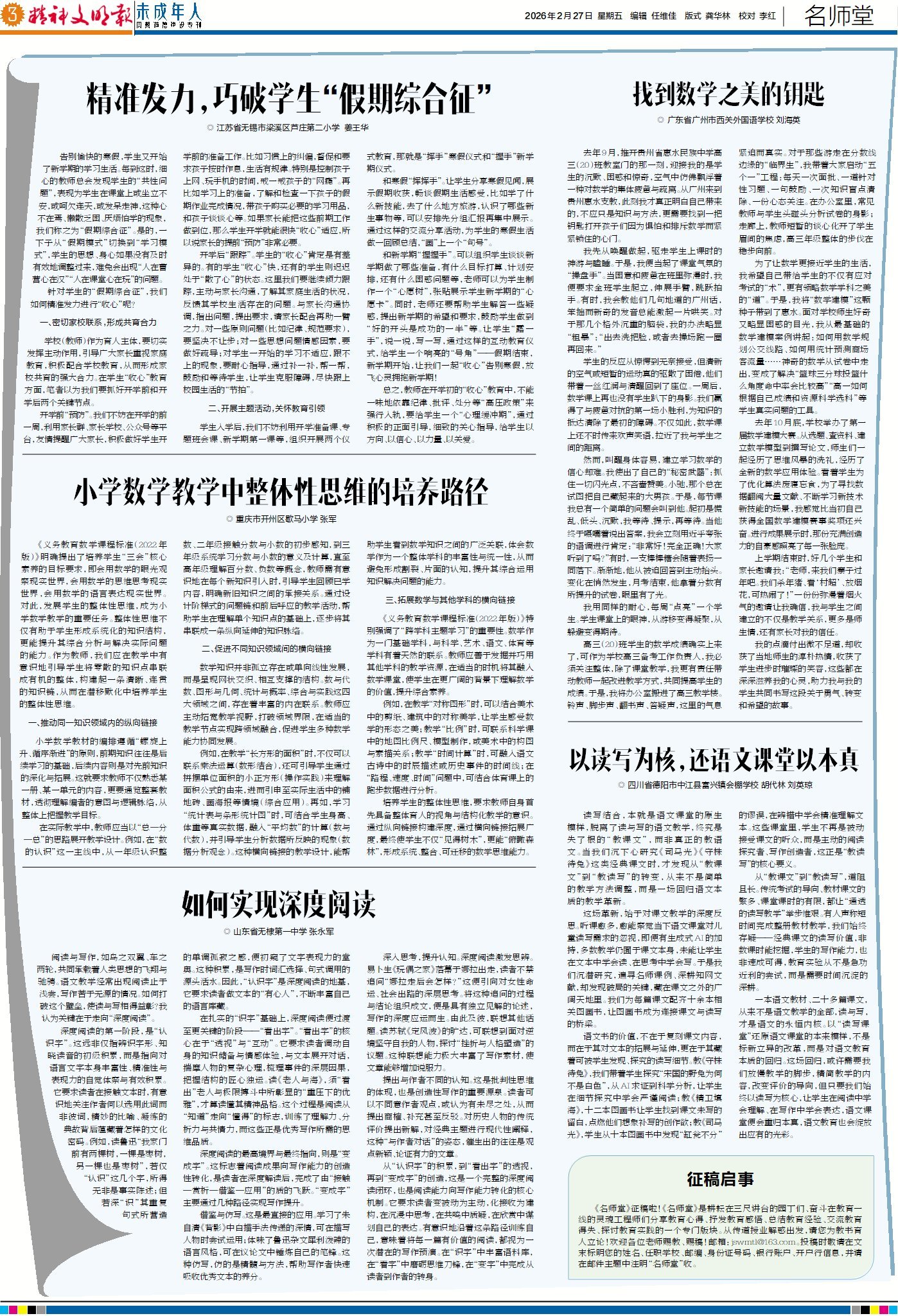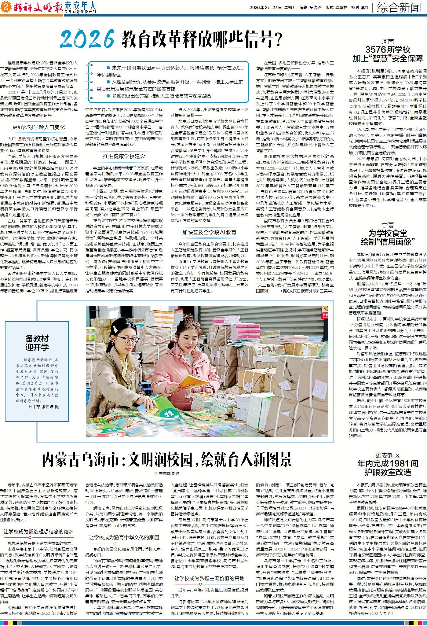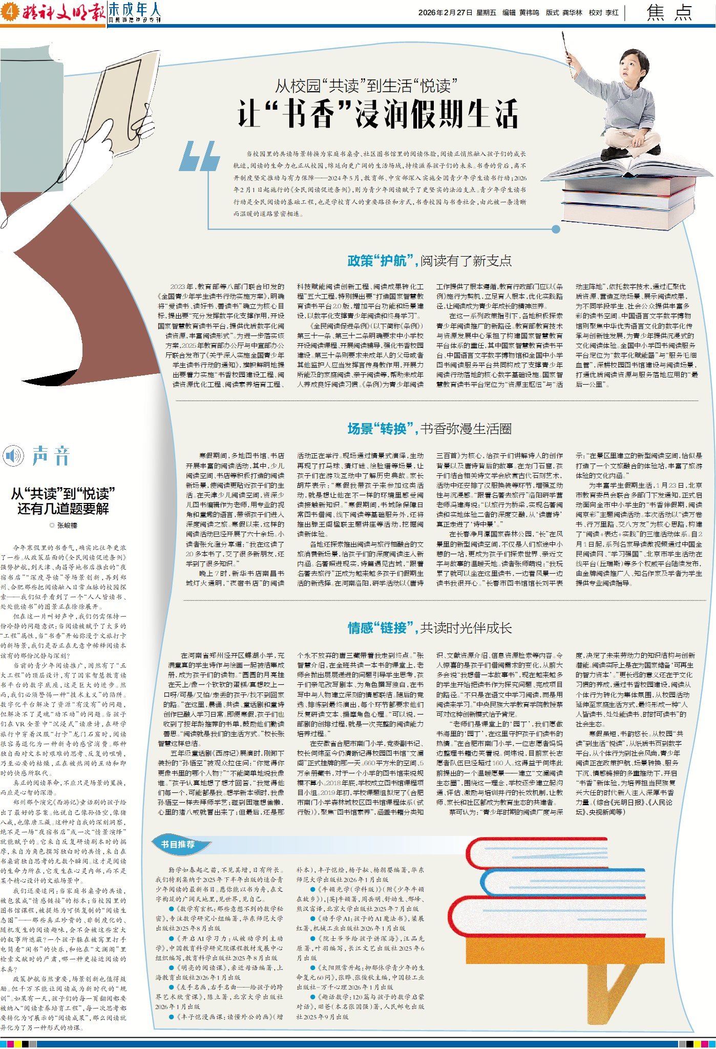 寒假虽短,书韵悠长。当校园里的共读场景转换为家庭书桌旁、社区图书馆里的阅读体验,阅读正悄然融入孩子们的成长轨迹,阅读的生命力也正从校园绵延向更广阔的生活场域,持续滋养孩子们的未来。书香的背后,都有哪些政策护航、暖心服务以及情感链接?今日4版“焦点”,带您探寻书香校园与书香社会的相连路径。