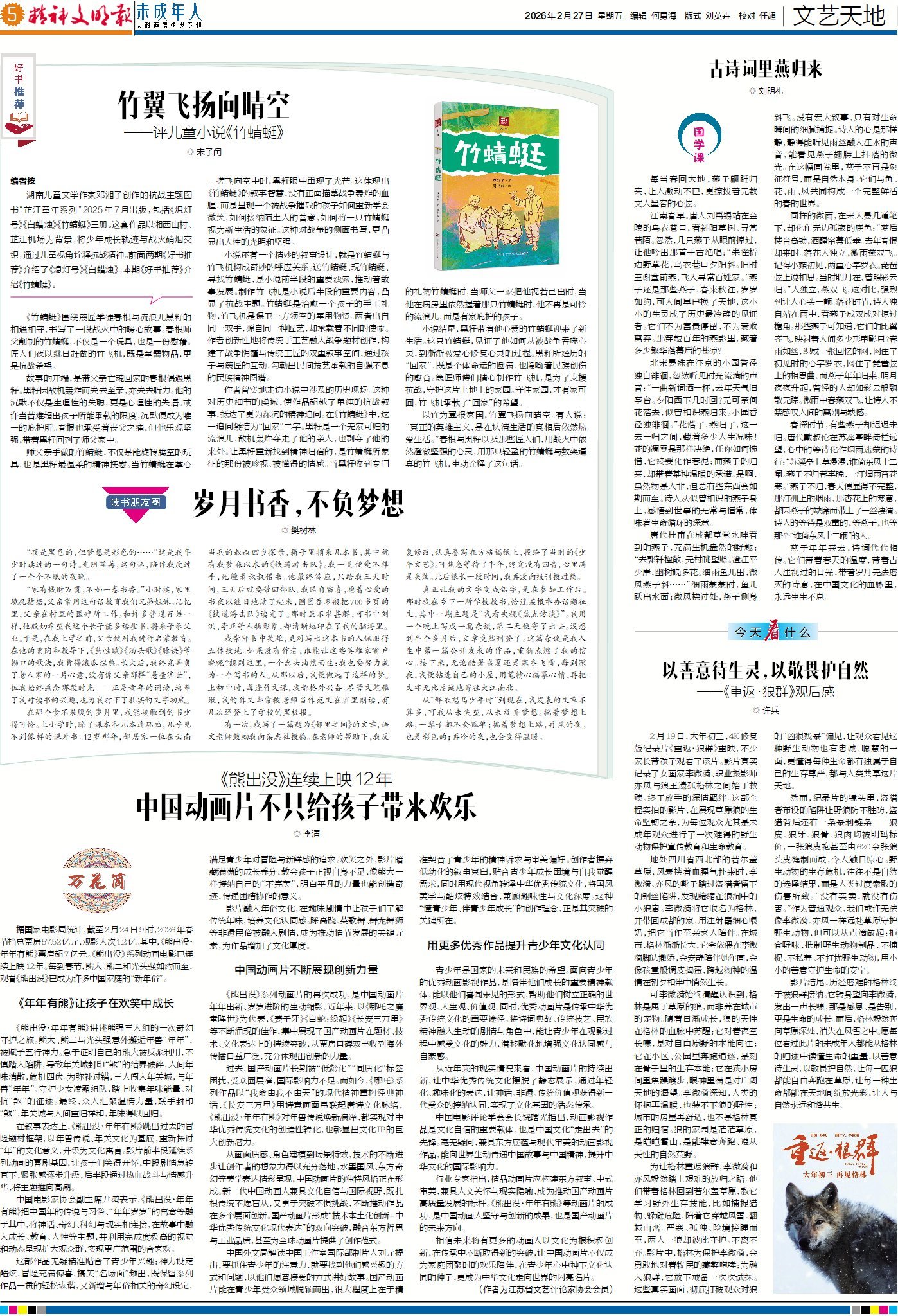 湖南儿童文学作家邓湘子创作的抗战主题图书“芷江童年系列”,包括《熄灯号》《白蜡烛》《竹蜻蜓》三册,以湘西山村与芷江机场为背景,将少年成长与战火硝烟交织,通过儿童视角诠释抗战精神。今日5版“文艺天地”《好书推荐》带您评读《竹蜻蜓》,一起聆听篾匠学徒春根与流浪儿黑籽在战火中相遇相守的暖心故事。