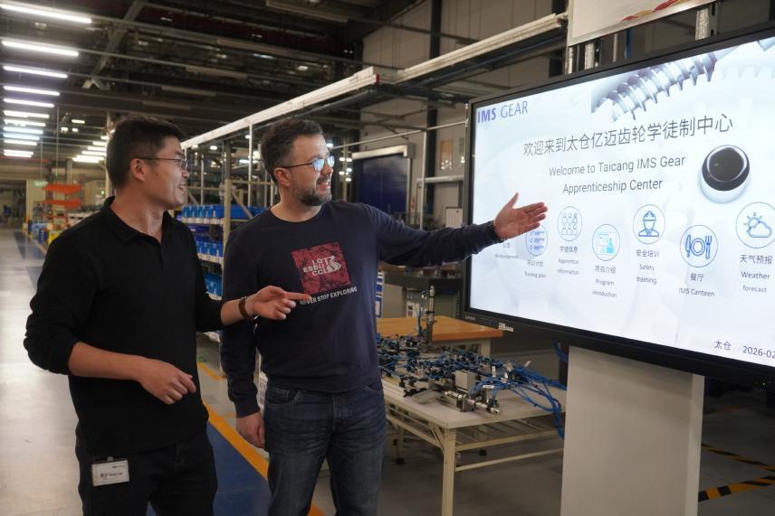 2026年2月24日,培训师托马斯(右)在亿迈齿轮(太仓)有限公司讲解双元制培训。(图片来源:新华社)