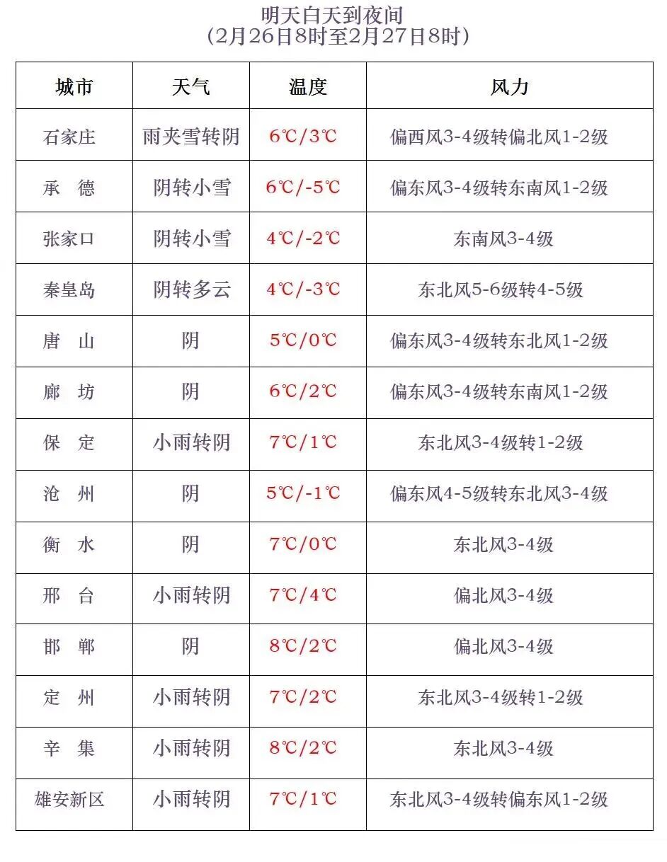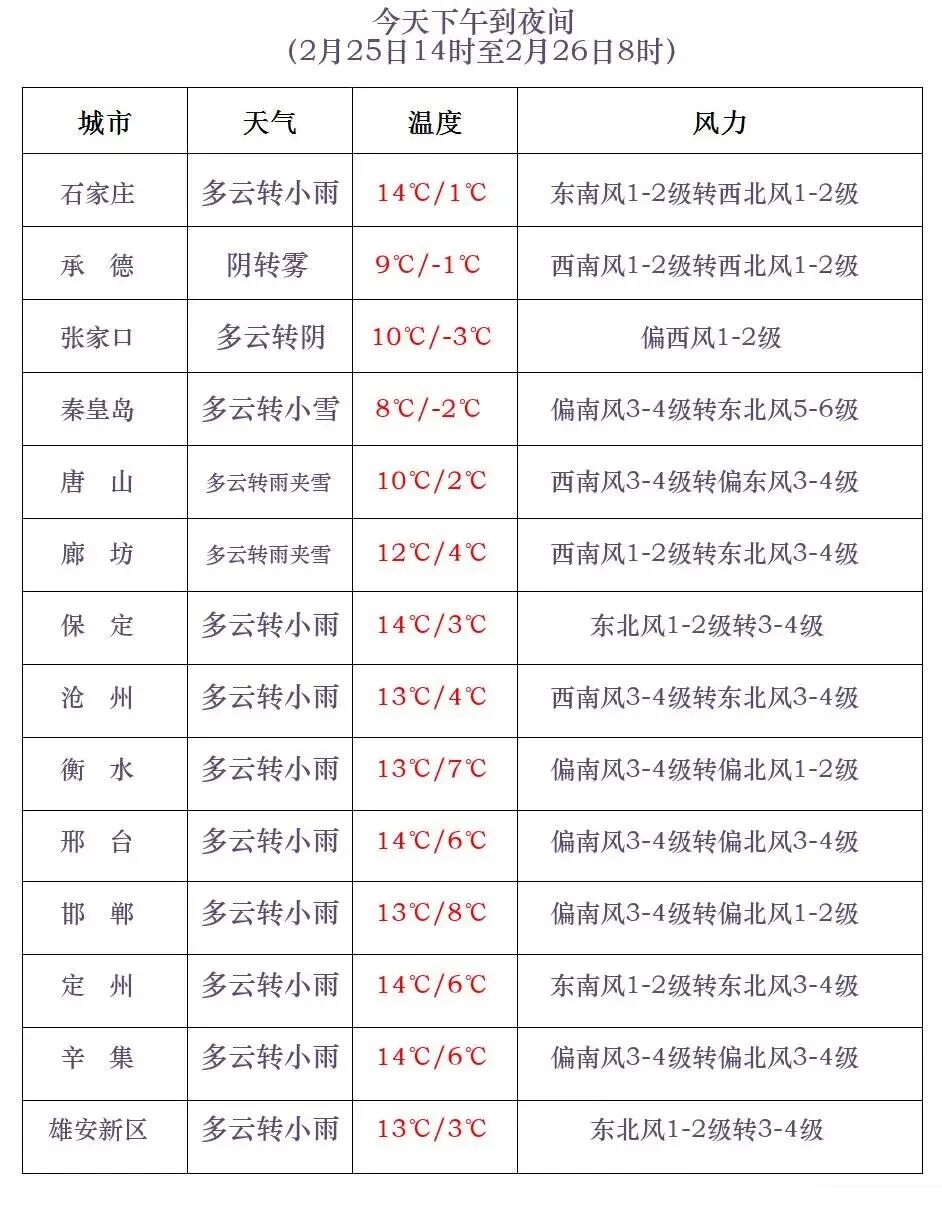 河北省气象台2026年02月25日11时发布天气预报: