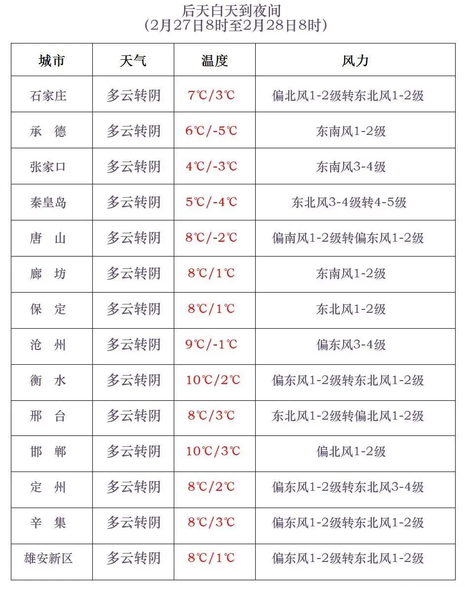27日夜间到28日,沧州、衡水、邢台东部、邯郸东部多云转阴有小雨,张家口、承德中北部多云转阴有小雪或零星小雪,承德南部、保定中北部、廊坊、唐山、秦皇岛多云转阴,其他地区多云转阴有小雨转雨夹雪或小雪。