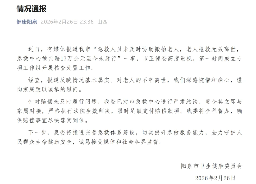 近日,有媒体报道我市“急救人员未及时协助搬抬老人,老人抢救无效离世,急救中心被判赔17万余元至今未履行”一事,市卫健委高度重视,第一时间成立专项工作组开展核查处置工作。