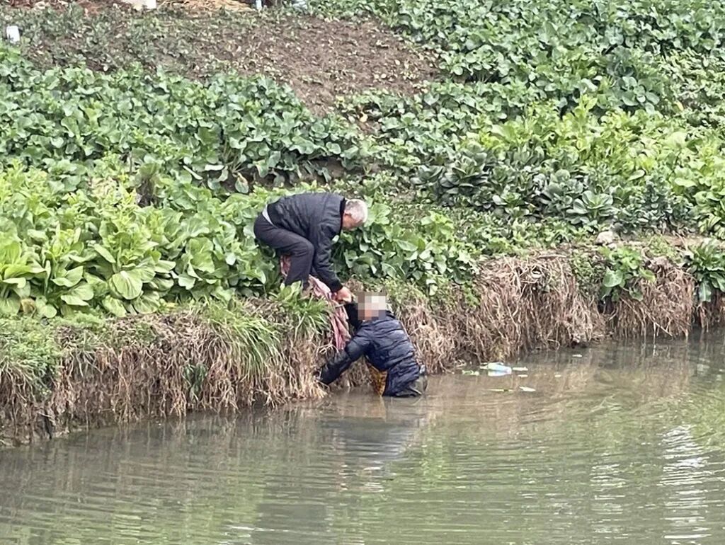 虽然落水点离岸边不远,但是落水老人年过八旬,体力早已不支,且身上的羽绒服被水浸透后变得沉重,根本无力自救。见状后,庞荣辉立刻将背包扔在地上,翻身越过栏杆,冲到岸边。由于徒手无法够到老人,情急之下,庞荣辉扯下岸边菜地里一条村民用来遮盖蔬菜的旧床单,将其拧成一股绳向老人抛去,最终成功将她拉上了岸。