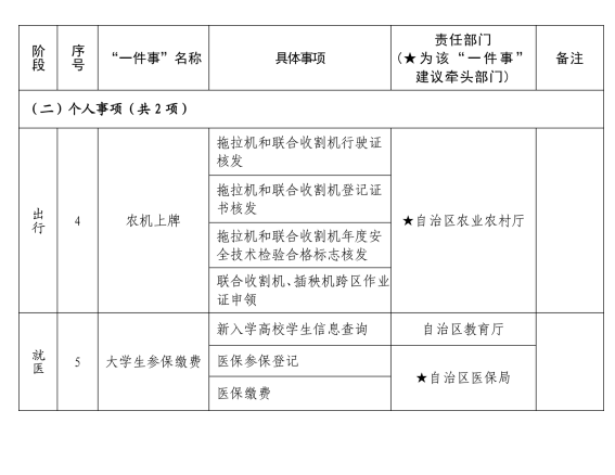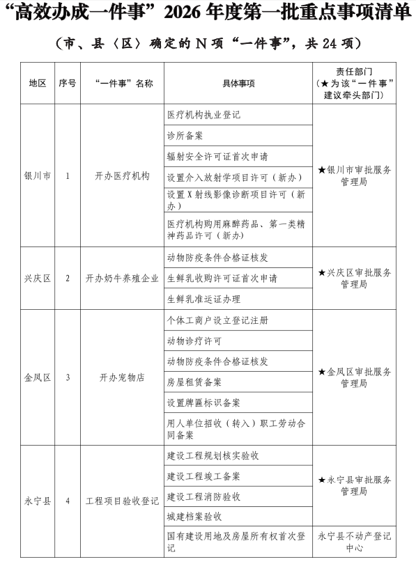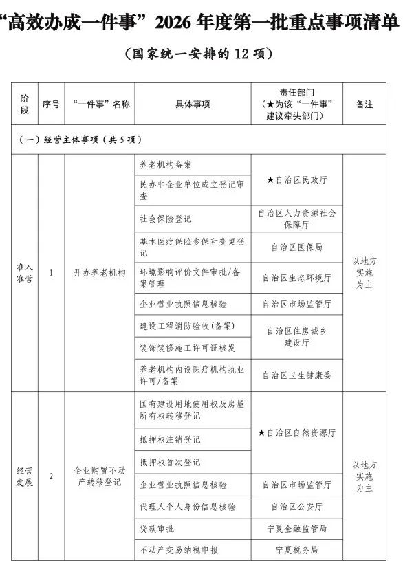 近日,自治区政府办公厅发布我区《“高效办成一件事”2026年度第一批重点事项清单》,包含国家确定的12项“一件事”、自治区确定的5项“一件事”以及市县(区)确定的24项“一件事”,不断提升政务服务便捷度与群众获得感。