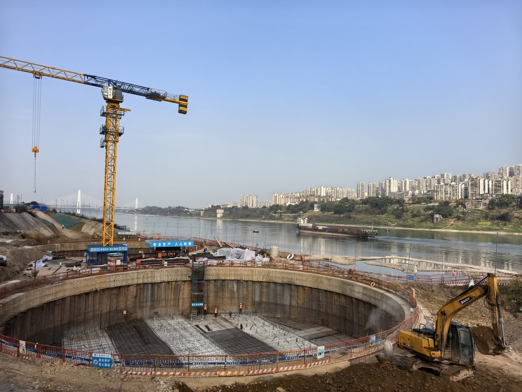 泸州长江五桥及连接线工程南岸工地,在直径28米长的拱座基坑内,工人们正在进行钢筋绑扎,四周还有挖掘机、运土车配合施工。