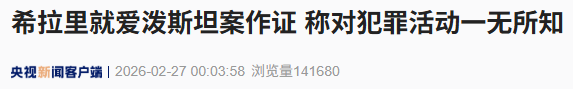 央视记者获悉,美国东部时间2月26日上午11时,美国前国务卿、前总统夫人希拉里·克林顿开始就爱泼斯坦案接受国会方面的质询。希拉里在作证时表示,她对爱泼斯坦的犯罪活动一无所知,也从未想起见过他。