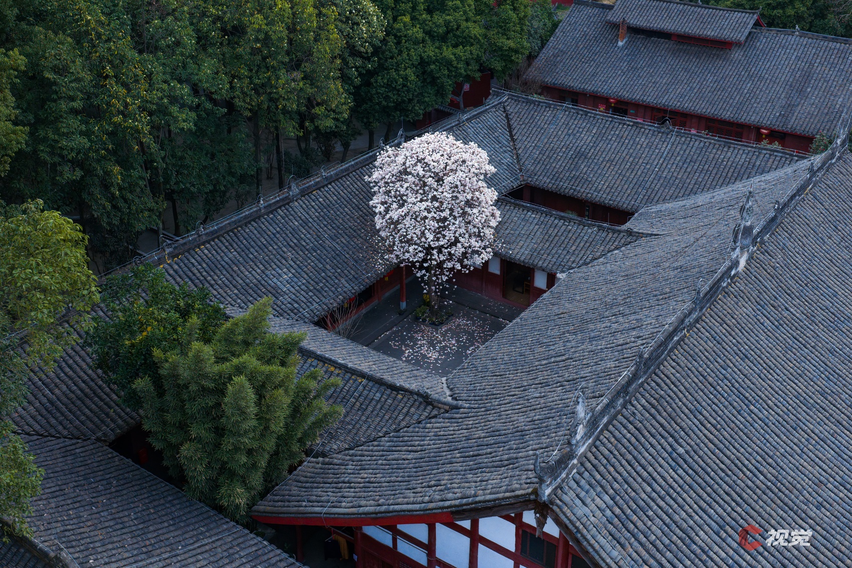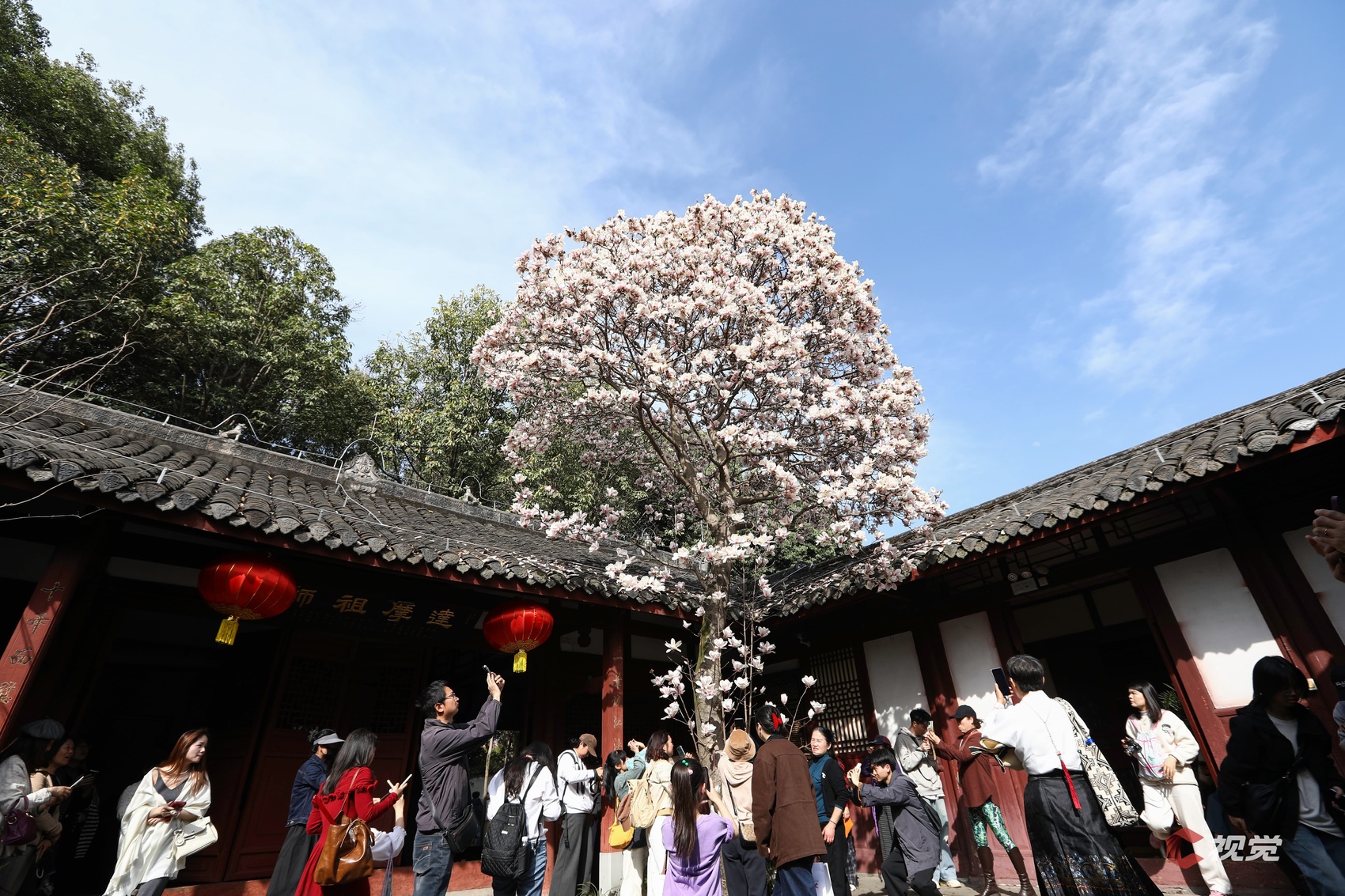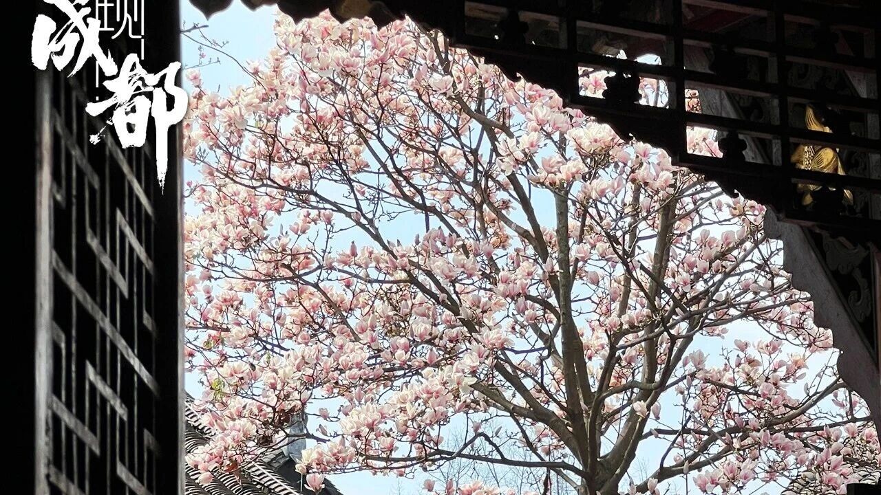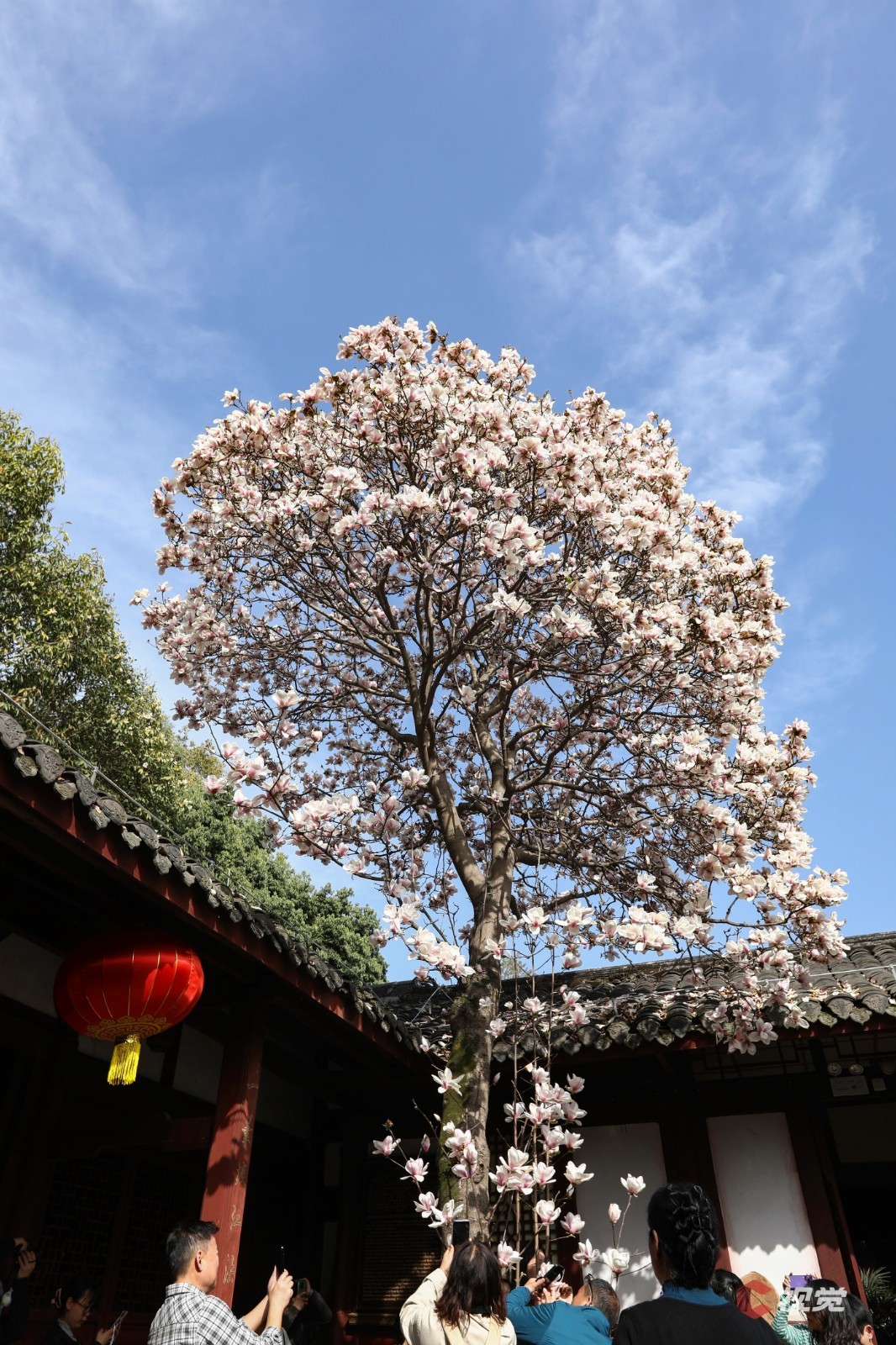 春风拂蓉城,玉兰报新春。2月26日,成都金牛区金华寺内的两株玉兰花迎来盛花期,吸引了许多人前来拍摄取景,迅速刷屏社交平台,成为当之无愧的“春日顶流”。洁白的花簇与红墙青瓦、飞檐翘角相映成趣,微风拂过,花瓣轻扬、落英铺阶,淡雅花香与这座百年古寺檀香交织,尽显中式美学意境。