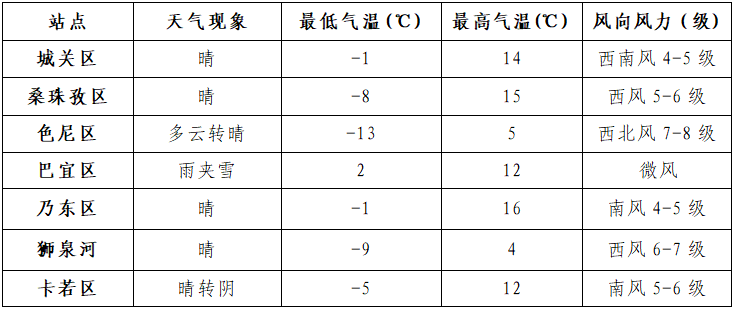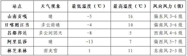 24小时趋势预报:今日夜间:林芝有小雪(雨),部分高海拔地方有中雪;那曲中部和东部、昌都中部和北部、山南南部多云间阴天,部分地方有阵雪;其他地方少云间多云。明日白天:林芝有小雪(雨),部分高海拔地方有中到大雪;昌都中部和北部、那曲东部、山南南部和日喀则南部多云间阴天,部分地方有阵雪;其他地方少云间多云。那曲、阿里、日喀则西部和南部有7级左右大风,沿雅鲁藏布江一线有5级左右阵风。