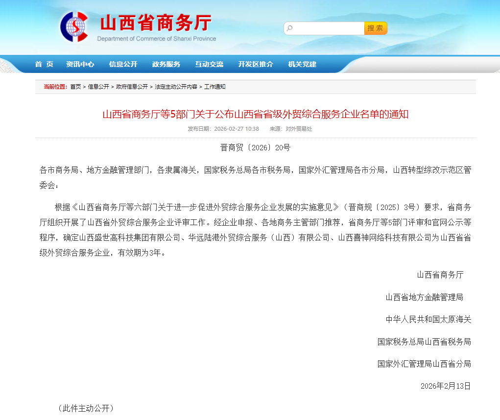 根据《山西省商务厅等六部门关于进一步促进外贸综合服务企业发展的实施意见》(晋商规〔2025〕3号)要求,省商务厅组织开展了山西省外贸综合服务企业评审工作。经企业申报、各地商务主管部门推荐,省商务厅等5部门评审和官网公示等程序,确定山西盛世高科技集团有限公司、华远陆港外贸综合服务(山西)有限公司、山西喜神网络科技有限公司为山西省省级外贸综合服务企业,有效期为3年。