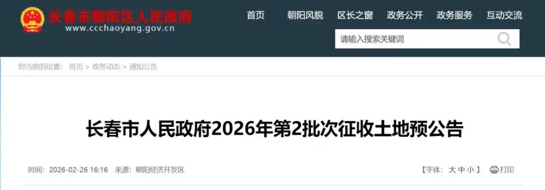 原文标题:长春市人民政府2026年第2批次征收土地预公告