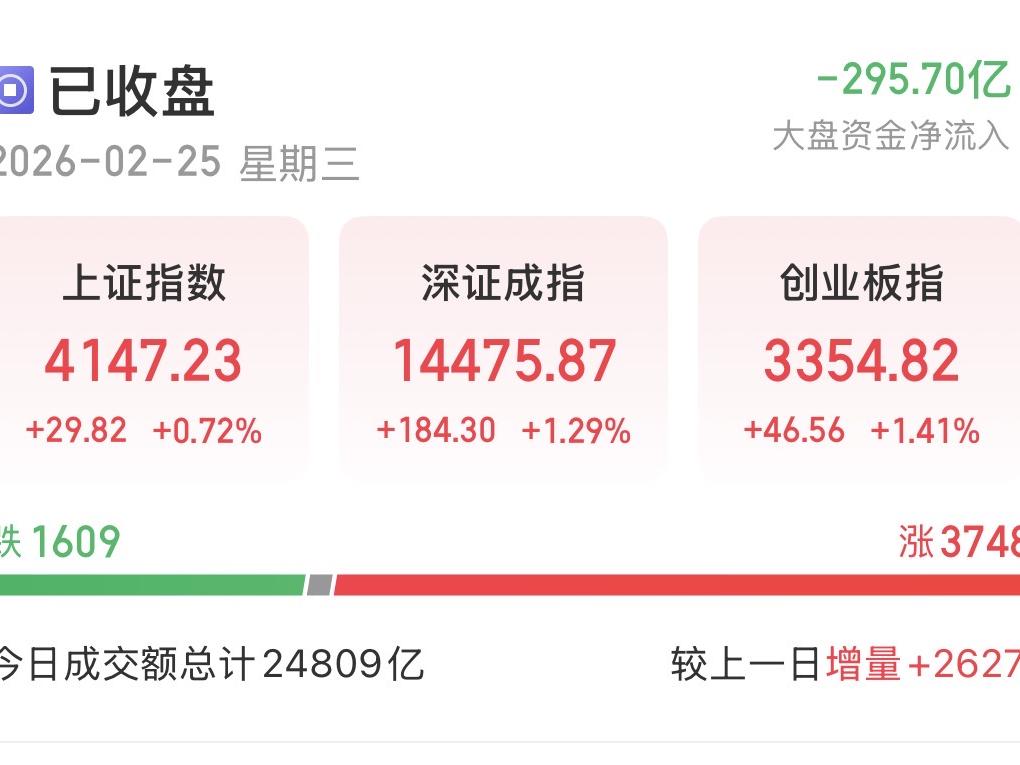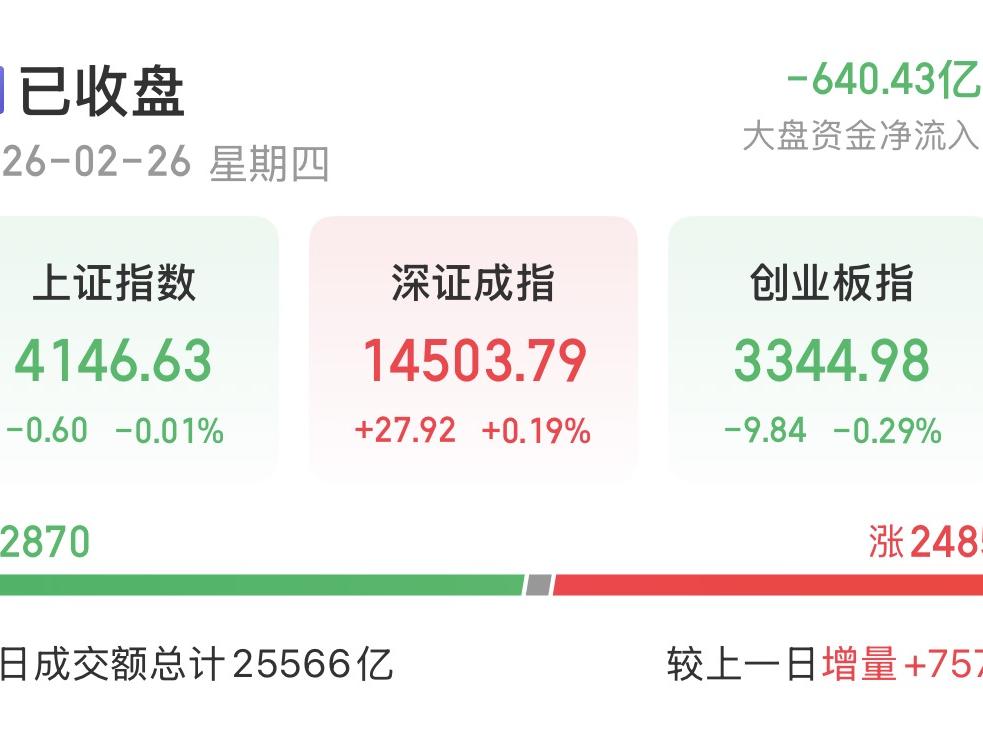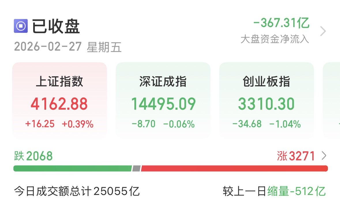 2月27日,A股三大指数涨跌不一。截至收盘,沪指涨0.39%,收报4162.88点;深证成指跌0.06%,收报14495.09点;创业板指跌1.04%,收报3310.30点。全市场成交额达到2.50万亿元,较昨日小幅缩量512亿元。但交易额已经连续4个交易日站稳2万亿元上方,表明市场交投保持活跃。个股层面,上涨个股超3200只,下跌个股2068只,整体涨多跌少。