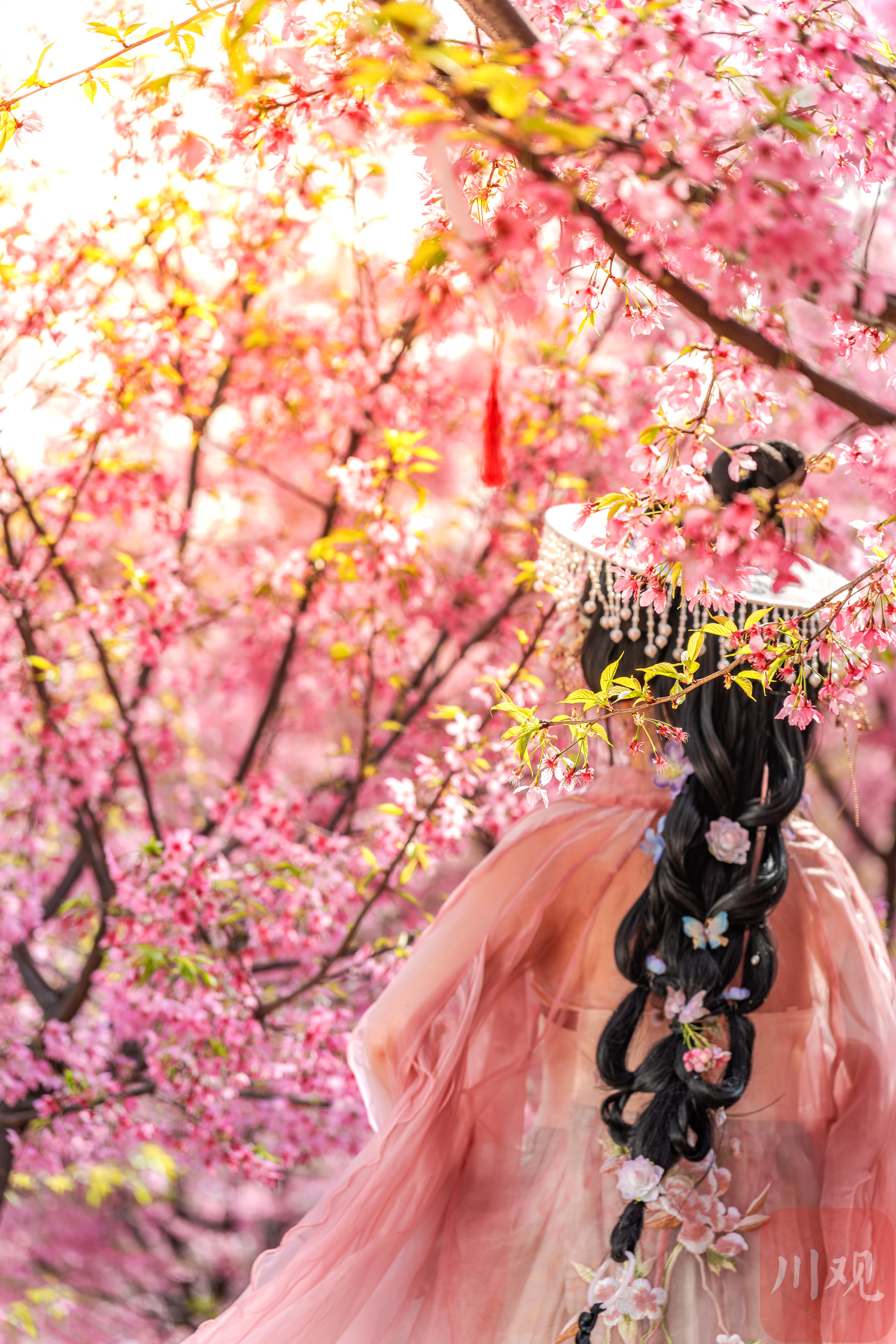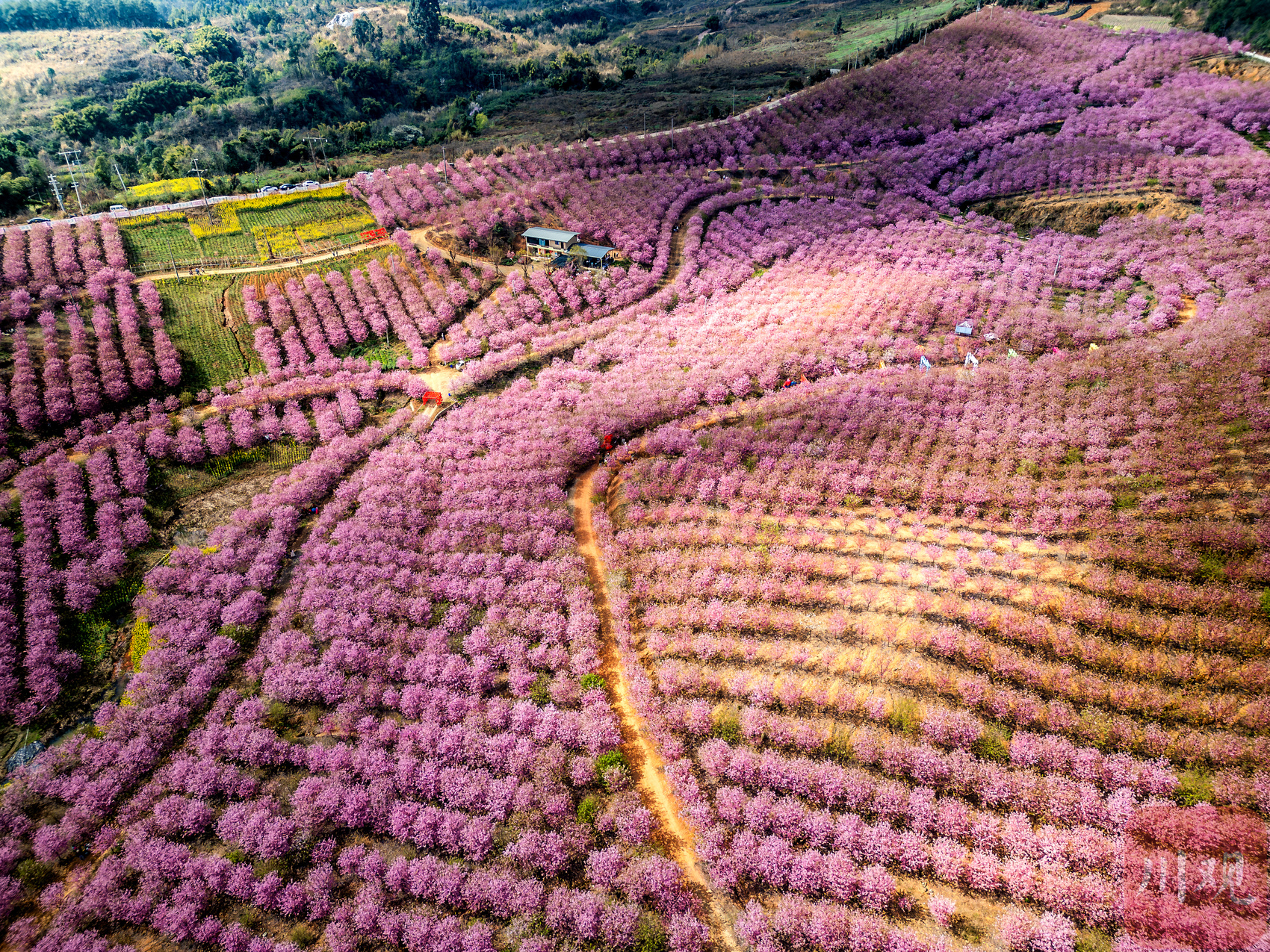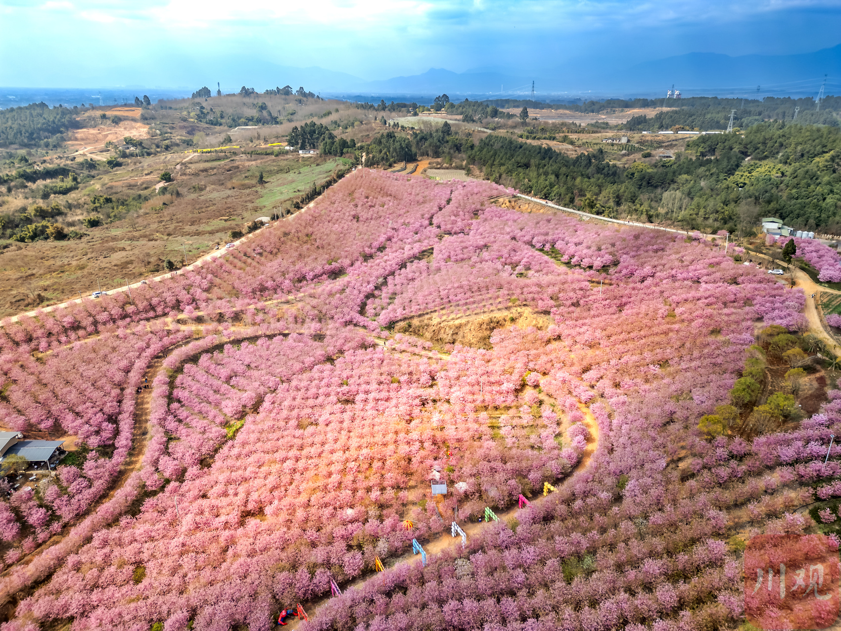 彭州市丽春镇东风村漫山樱花谷,连片樱花树沿山势层层排布,粉黛如云、凝霞满坡。
