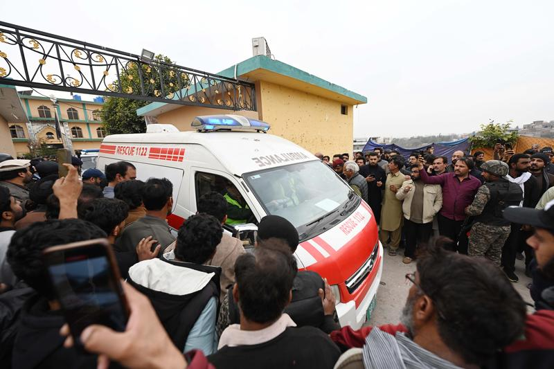 2月6日,在巴基斯坦首都伊斯兰堡,救护车离开爆炸现场。巴首都伊斯兰堡一清真寺当天发生爆炸。 新华社发 (艾哈迈德·卡迈勒摄)
