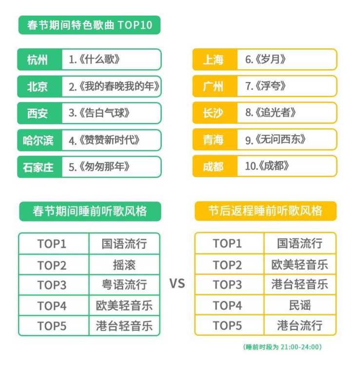 有意思的是,春节期间的21点到24点,睡前听歌风格与节后返程睡前听歌风格所形成不少的反差:不少用户在该时段用摇滚“嗨到”深夜以表达在家的愉快,相对应的,返程期间,这一时段的用户则开始听淡淡的民谣。正所谓见微知著,这些都从侧面说明了大家在假期和工作后对音乐不同的需求。音乐已经成为大家情感的一个连接点。
