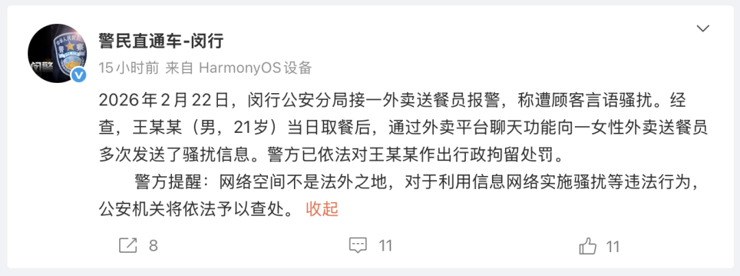 2026年2月22日,闵行公安分局接一外卖送餐员报警,称遭顾客言语骚扰。经查,王某某(男,21岁)当日取餐后,通过外卖平台聊天功能向一女性外卖送餐员多次发送了骚扰信息。警方已依法对王某某作出行政拘留处罚。