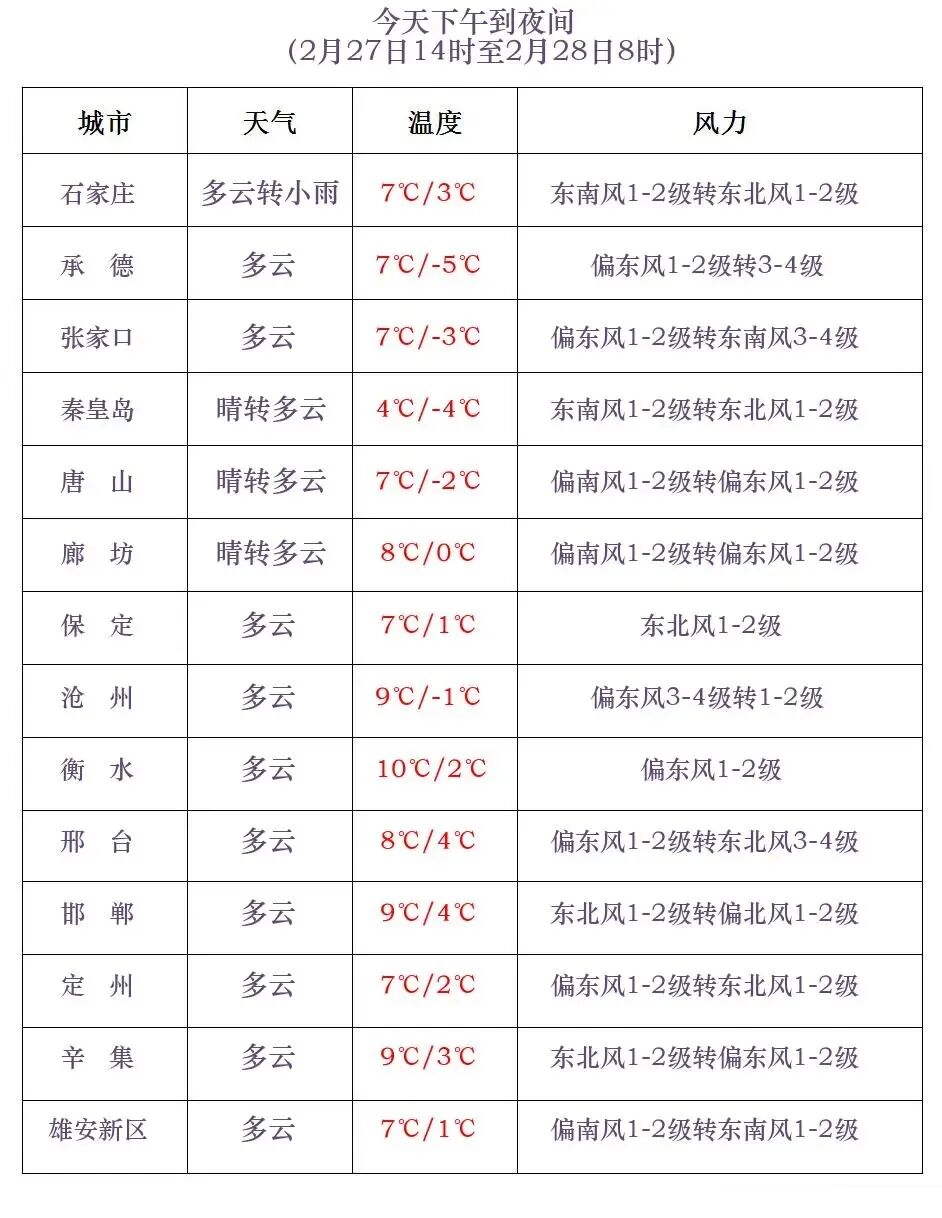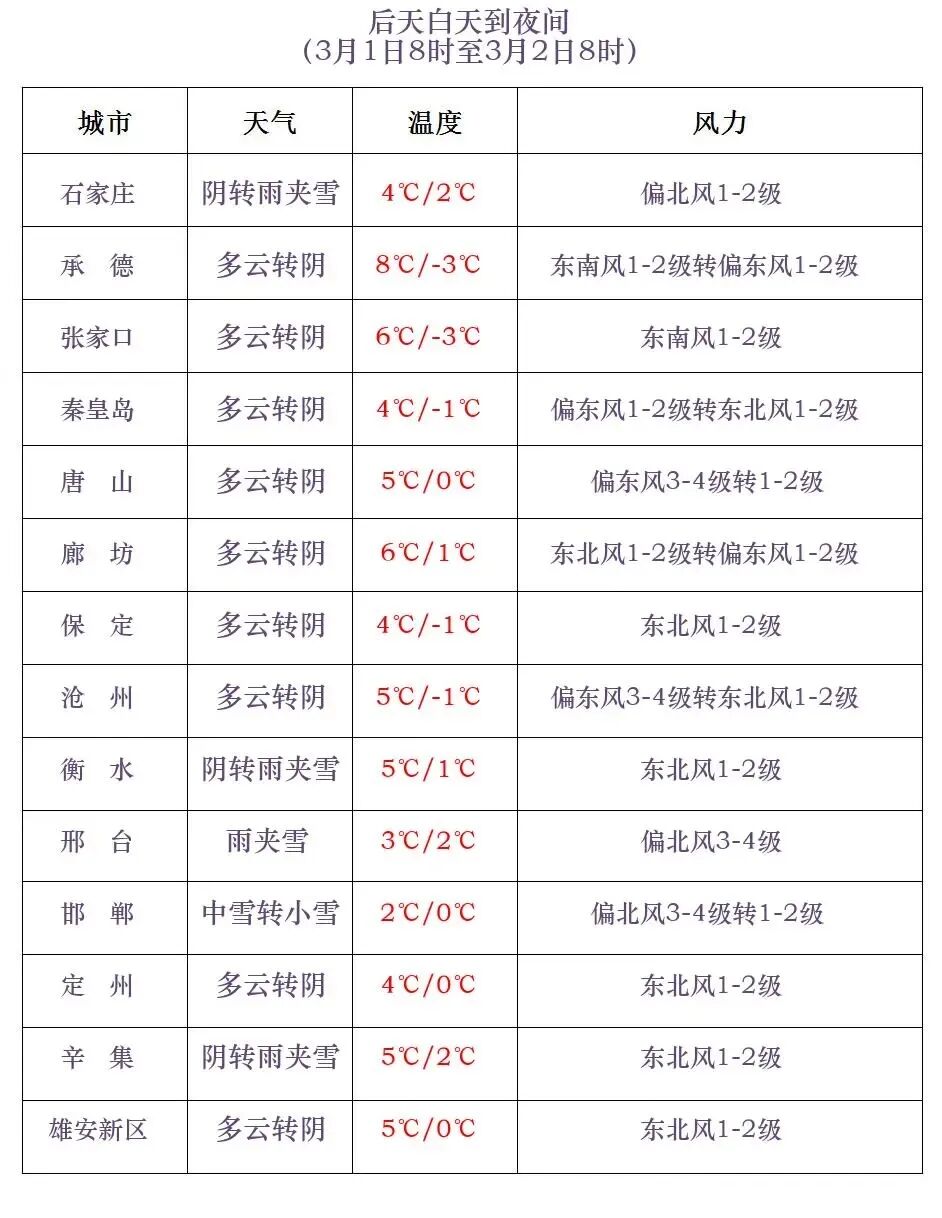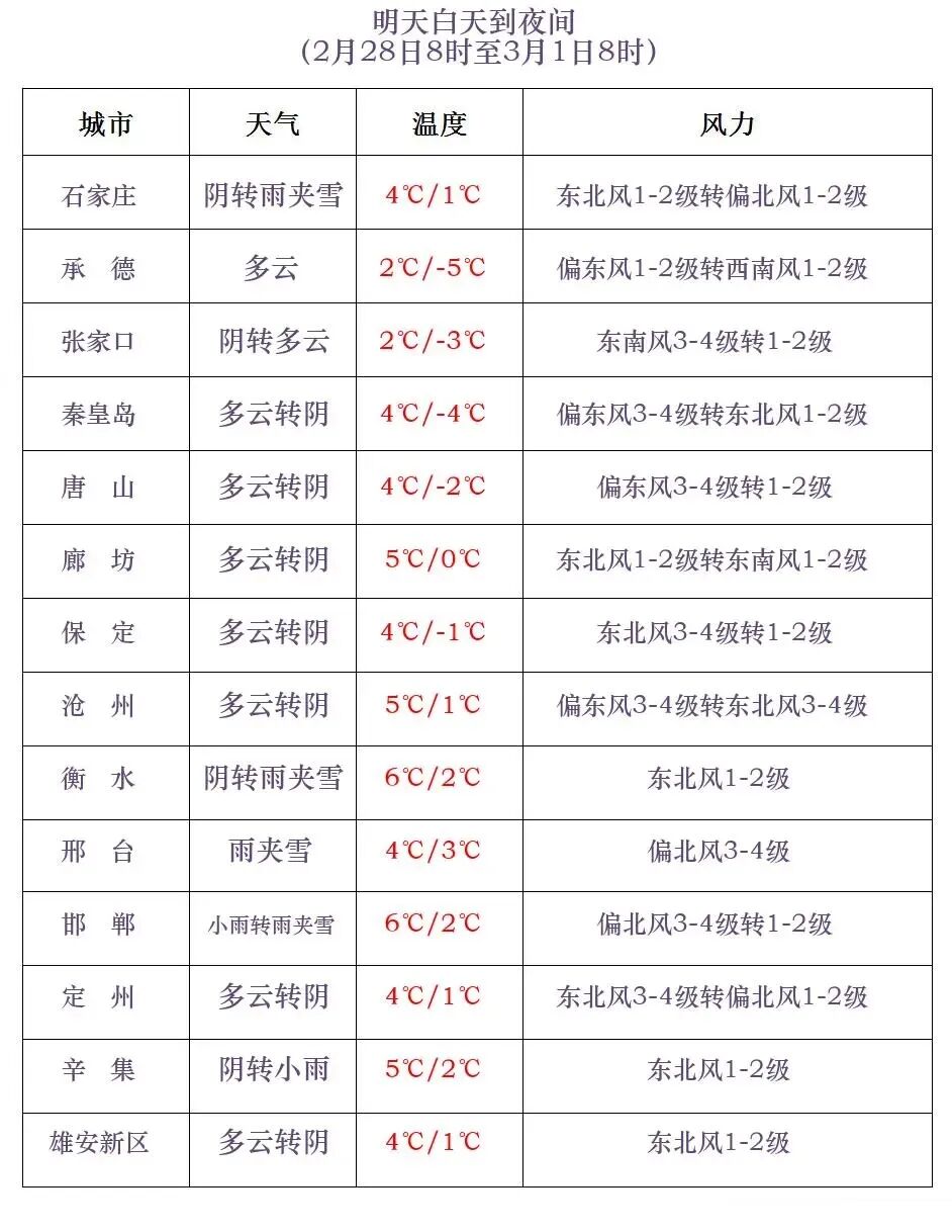 明天夜间到3月1日,石家庄、沧州以南地区阴有雨夹雪或小雪,其中邢台西部和南部、邯郸有中到大雪;其他地区多云。