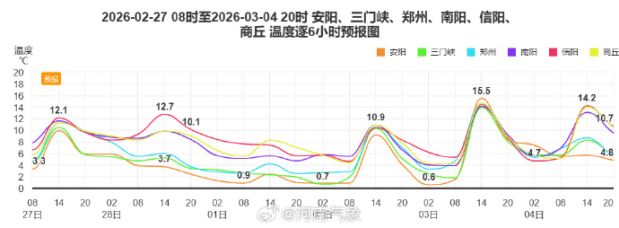 2026年2月27日至3月5日郑州气温趋势图(单位:℃)