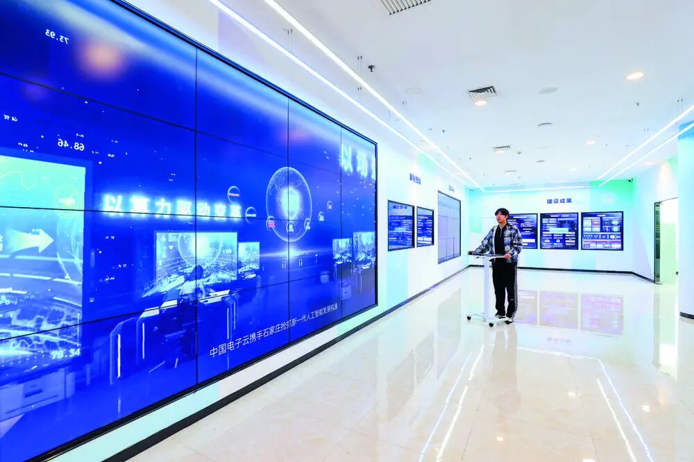 在石家庄人工智能计算中心控制中心,中电智广系统技术有限公司工作人员进行人工智能计算展示。