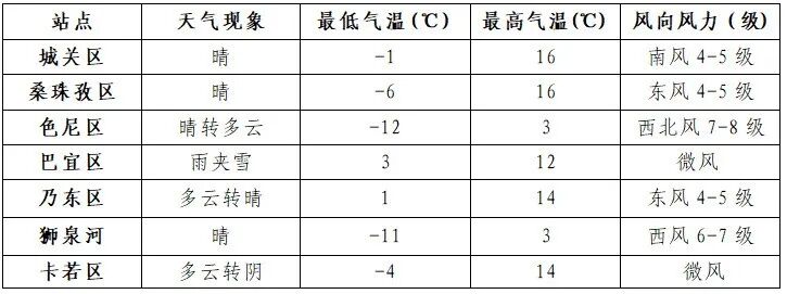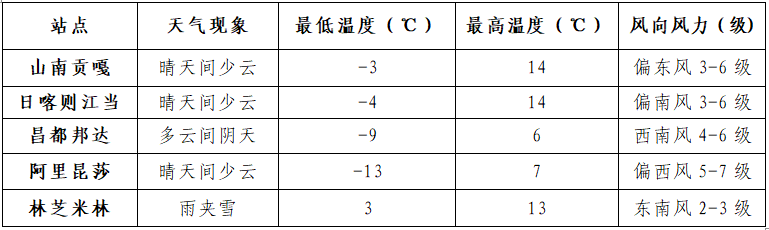明天白天:林芝和山南南部有小雪(雨),部分地方有中雪,其中墨脱和波密高海拔地方有大到暴雪;昌都中部和北部、那曲中部和东部、日喀则南部和阿里南部多云间阴天,部分地方有阵雪;其他地方少云间多云。那曲、阿里、日喀则西部和南部有7至8级大风,沿雅鲁藏布江一线有5级左右阵风。