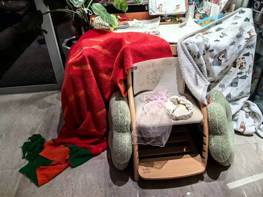 但这只是开始。客厅茶几上贴着“茶杯的家”;阳台花盆挂着“多肉,别浇太多水”;大门上贴着自创对联。客厅一角,悠悠用毯子搭起“安全屋”,椅背上写着:“秘密基地,戴上其一可入内”——椅子上放着几个发箍当“门票”。