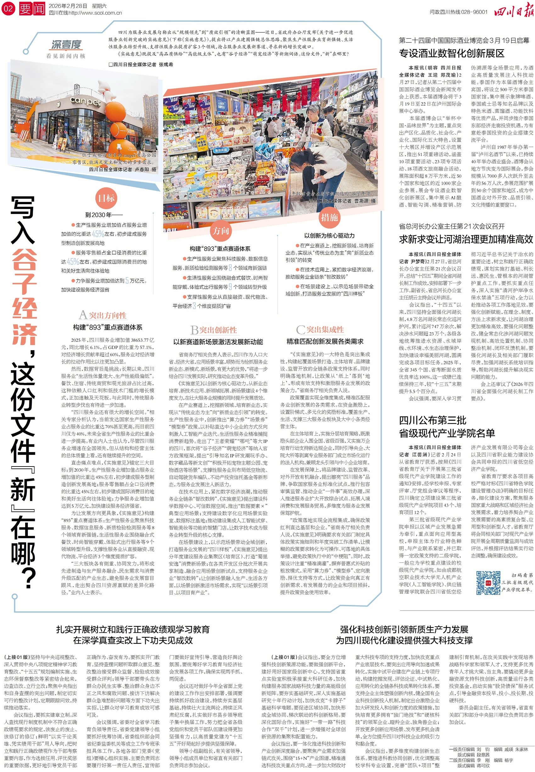 近日,在四川省出台的一份实施意见中,“谷子经济”“萌宠经济”等新潮词语被写入文件。该文件锚定“力争服务业增加值达到5万亿元,加快建设服务经济强省”等目标,提出聚焦生产性服务业育新强链、生活性服务业转型升级、支撑性服务业提质扩容三个领域,以新赛道新场景激活服务业发展新动能。今日二版,看四川如何为服务业发展绘蓝图。
