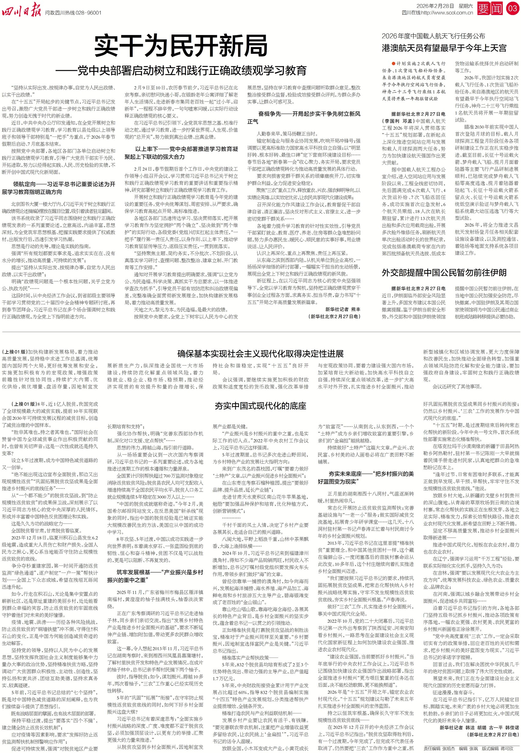 2026年度中国载人航天飞行任务近日公布,据介绍,我国计划实施2次载人飞行任务,来自港澳地区的航天员有望最早于今年执行空间站飞行任务,神舟二十三号飞行乘组1名航天员将开展一年期驻留试验。今日三版,看中国载人航天新年新计划。