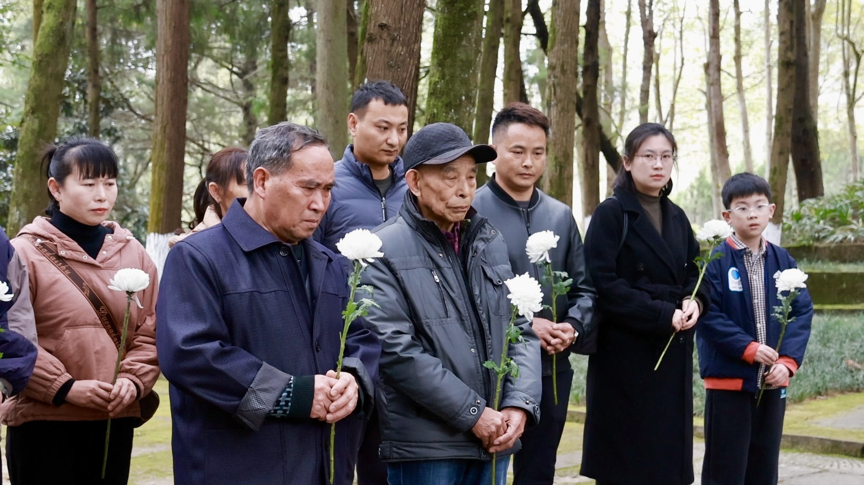 在唐全弟烈士墓碑前,70岁的唐德军及家人静静伫立、低头默哀,随后依次上前,恭敬献花。唐德军缓缓拿出随身携带的瓶子,俯身轻轻捧起一抔墓前泥土,小心翼翼地装入瓶中。他凝视着墓碑,声音哽咽却无比坚定:“幺爷爷,我带一些您墓前的泥土回去,安放在您父母的坟前,跟我们回家吧。”一句朴素的话语,承载着跨越岁月的牵挂与思念;一抔故土,连接着血脉亲情,更藏着家人无尽的缅怀与慰藉。