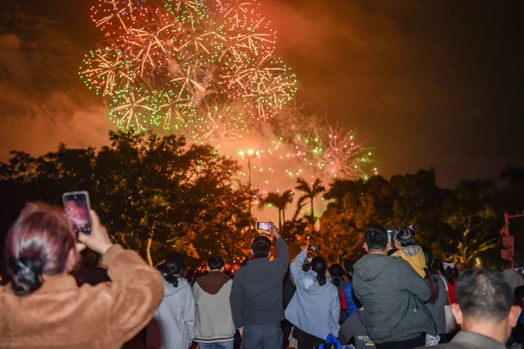 20:45,无人机表演率先在万绿园上空开启,通过倒计时的方式引出备受期待的“七彩祥云”烟花,瞬间点燃2026海口元宵烟花晚会的热情(烟花秀地点:美源游艇码头)