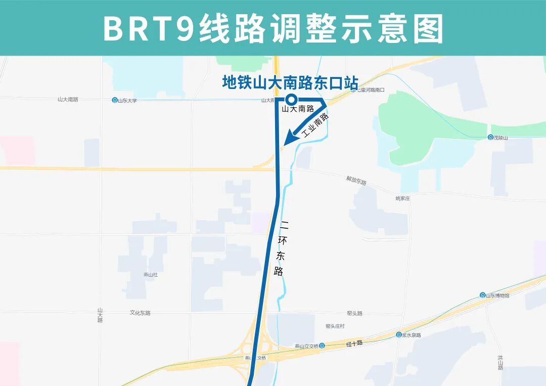 BRT9号线调整后由大涧沟北开往地铁山大南路东口站,沿二环东路向北,然后单向沿山大南路向东、工业南路向西至二环东路向南恢复原线,沿途增设二环东路和平路(BRT)、甸柳庄(BRT)、二环东路工业南路(路东)、地铁山大南路东口站(路南)、工业南路西口(路北)站点。