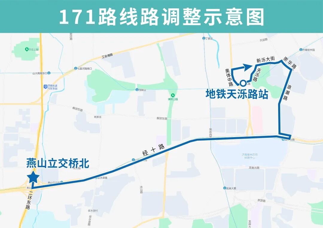 171路调整后由燕山立交桥北开往地铁天泺路站,沿二环东路向南、经十路向东、浪潮路向北、崇华路向北、新泺大街向西,然后单向沿天泺路向南再向西、奥体中路向北至新泺大街向东恢复原线,沿途增设燕山立交桥北、地铁燕山立交桥站(路北)、浪潮路南口(路西)、省干部学院(路西)、雅居园小区南门(路西)、雅居园小区(路西)、雅居园小区北门(路南)、地铁天泺路站(路北)、燕山新居北(路东)、新泺大街奥体中路(路南)站点,撤销青年桥、经八路青年西路(路北)、青年西路(路东)、经八路胜利大街、经十纬一(路南)、纬一路经十路(路东)、省体育中心、全民健身中心、地铁泉城公园站、经十路舜耕路、千佛山、经十路历山路、千佛山医院、地铁山师东路站、经十路燕子山西路、经十路山大路、经十路燕子山路、燕山立交桥西、新泺大街奥体中路(路北)、燕山新居北(路西)、省立医院东院区(路西)、奥体中路经十路(路西)站点。