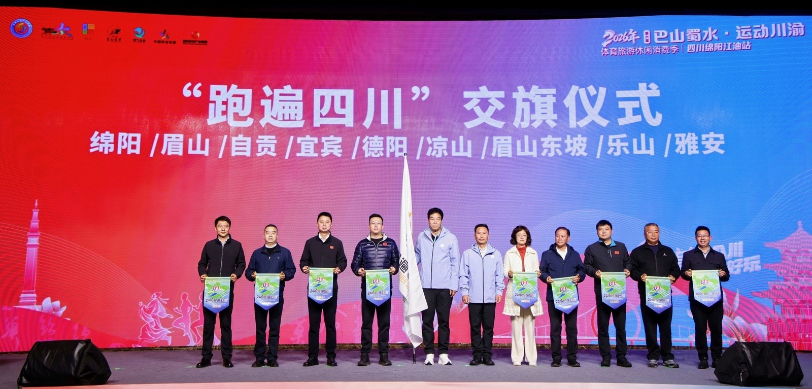 活动启幕现场,主办方先后举行了四川省体育标准化技术委员会揭牌、成渝体育产业联盟新进会员授牌、“跑遍四川”交旗等仪式,运动员代表也邀请全国各地的选手一同参与,以体育+美食等形式体验江油夜间经济新活力。