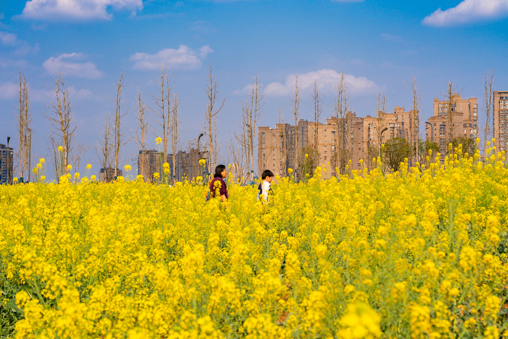 一沐春风万顷黄,油菜花开满地金。连日来,随着气温逐渐回暖,资阳市民服务中心外城区的油菜花田迎来盛放期,金黄花海与城市建筑相映成趣。